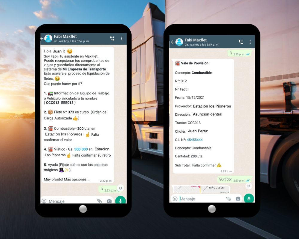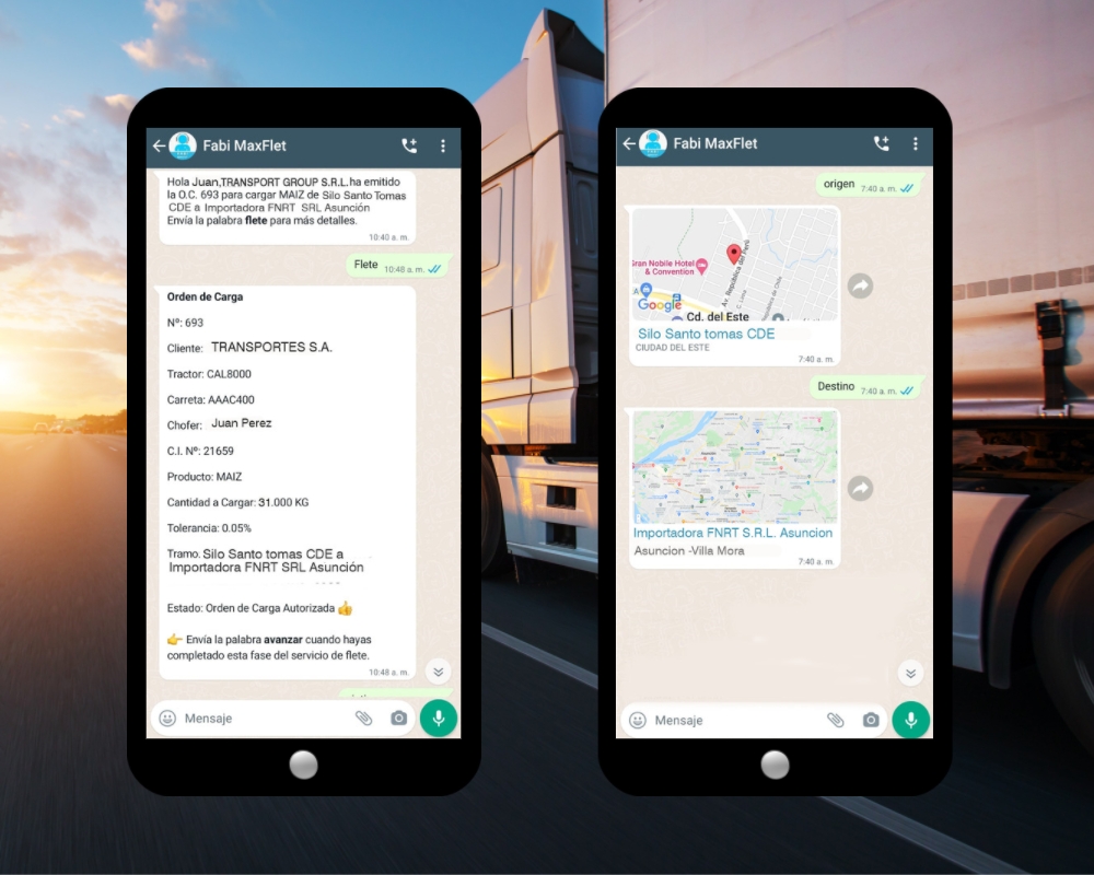 MaxFlet ha desarrollado un robot de WhatsApp con el cual el chofer puede interactuar y acceder a información referente a los servicios de flete asignados a él, (y solamente a él) solicitar puntos de origen y destino de servicio de flete, con ubicación exacta de los locales o sucursales registrados en el sistema. Información sobre Vales de Combustible y Viático vinculados al servicio de flete actual. Ubicación del surtidor del cual retirar los vales, valores y conceptos de los vales.